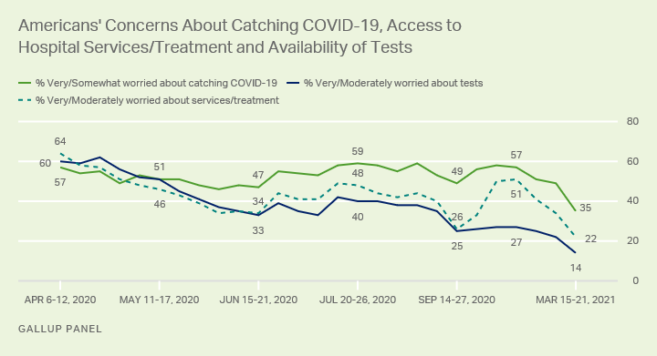 WASHINGTON, D.C. -- At the same time Americans' satisfaction with the rollout of the COVID-19 vaccine has surged, their concerns about getting the virus and about the availability of coronavirus tests and hospital services/treatment have fallen to record lows.