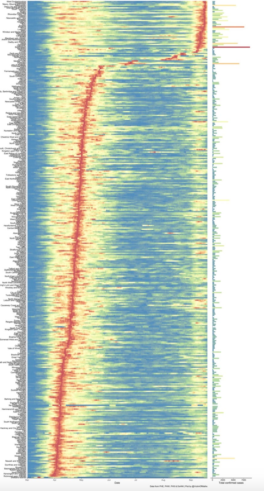 A clever way to visualize COVID-19 cases in the UK. Red is the period when most cases were reported and the blue period is the before and after.