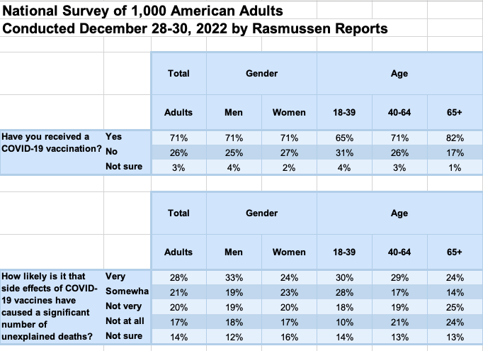 Rasmussen Reports conducted a survey in December 2022 about the “Died Suddenly” phenomenon. The survey asked respondents: