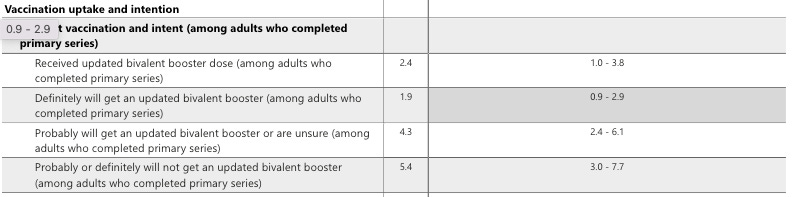 There is ancillary data around the surveys picking up injuries from the vaccine that people have experienced including this breakdown by vax attitude showing that perhaps as much as 7% of those who definitely will NOT get the BIVALENT booster had a bad reaction to the vaccine that they took earlier.
