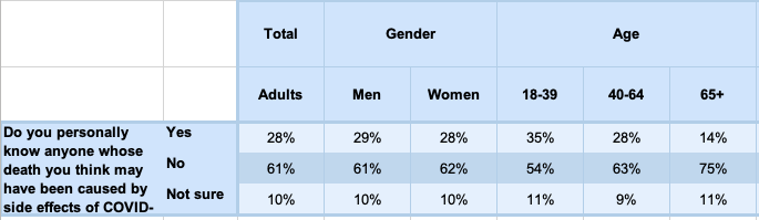 Next is this detail on the age breakdown for the question: “Do you personally know anyone whose death you think may have been caused by side effects of COVID-19 vaccines?”