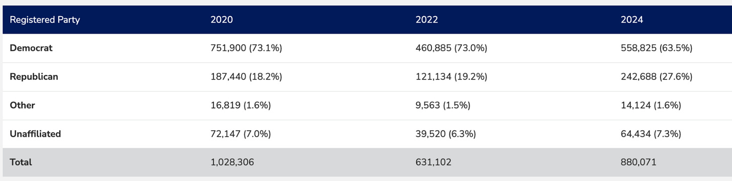 Democrats have seen a 26% decrease in early voting from 2020 but a 21% increase from 2022.