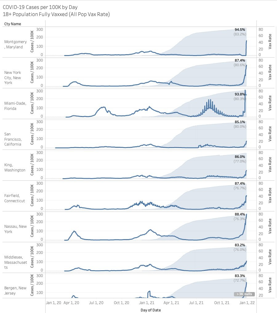 The wall of cases, allegedly brought about by the Omicron variant, senda case loads into the stratosphere eclipsing previous records set — even in locations with high vaccination rates. Here’s a sample of counties with high vax rates and the case rates over the pandemic. Next week will be a key week to determine how impactful this current surge will be: