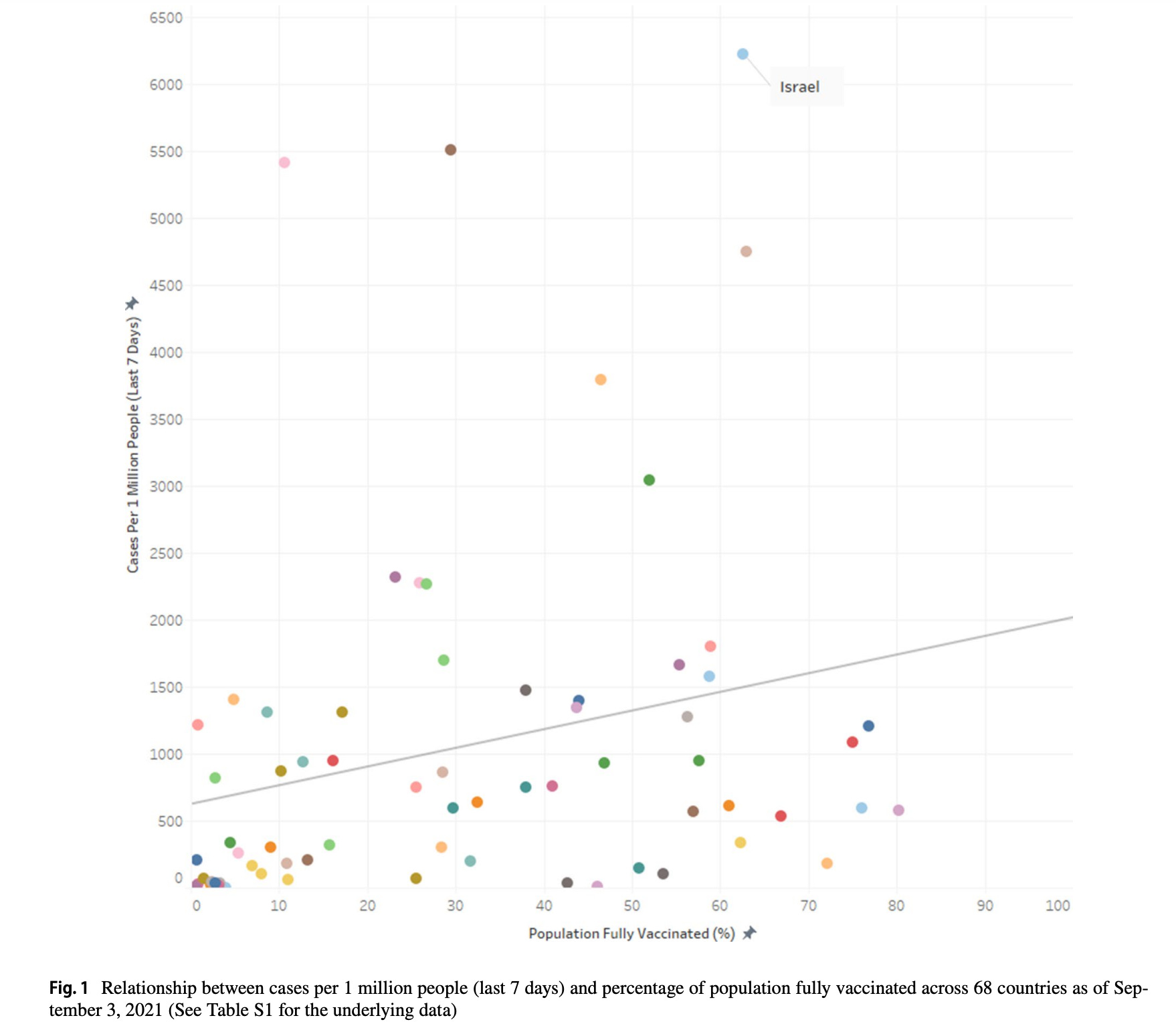 At the country-level, there appears to be no discernable relationship between percentage of population fully vaccinated and new COVID-19 cases in the last 7 days (Fig. 1). In fact, the trend line suggests a marginally positive association such that countries with higher percentage of population fully vaccinated have higher COVID-19 cases per 1 million people.