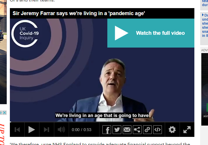 Just to make sure we get the point, the Mail kindly embeds a clip of Sir Jeremy Farrar from the Covid Inquiry telling us we’re living in a “pandemic age.” With Farrar now Chief Scientist at the World Health Organisation – the international body with the sole power to declare a pandemic – one suspects this may be a self-fulfilling prophecy.