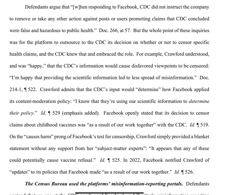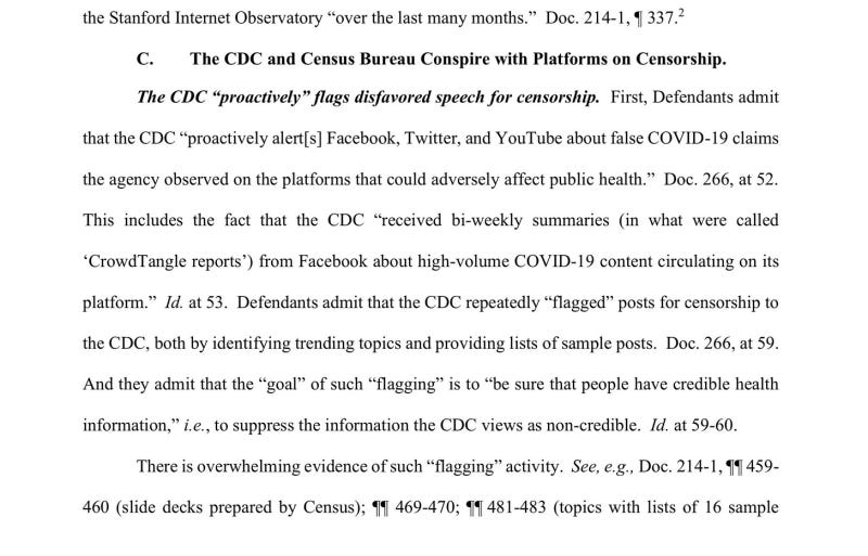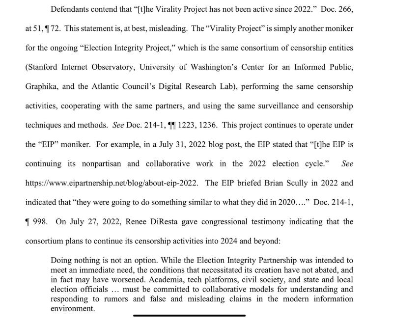 All throughout, the plaintiffs’ brief documents in detail the partnership between these institutions and the “private,” taxpayer-funded organizations they used to do their dirty work. Of particular interest here is the Virality Project and Stanford Internet Observatory (SIO). (As it happens, I am mentioned in the Twitter files due to a SIO report. They tried to dissect and discredit my legal analysis and failed.)
