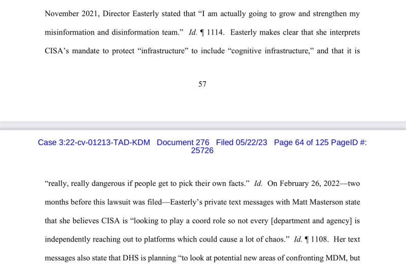 Jen Easterly, head of CISA actually said the following (this is a direct quote): it is “really, really dangerous if people get to pick their own facts.” The condescending suggestion is that we need the government to pick our facts for us and spoon-feed these facts to us. She wanted to organize CISA to act as the coordination point for allagencies—hence the disinformation governance board that was later “disbanded” due to public criticism.