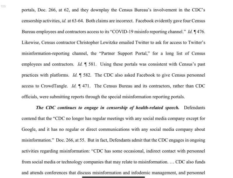 Here we continue with a lightly edited version of reporter Tracy Beanz’s coverage of the case and our activities in court last week. Today we discuss how even the *Census Bureau* and the *Department of Treasury* engaged in the government’s censorship activities.