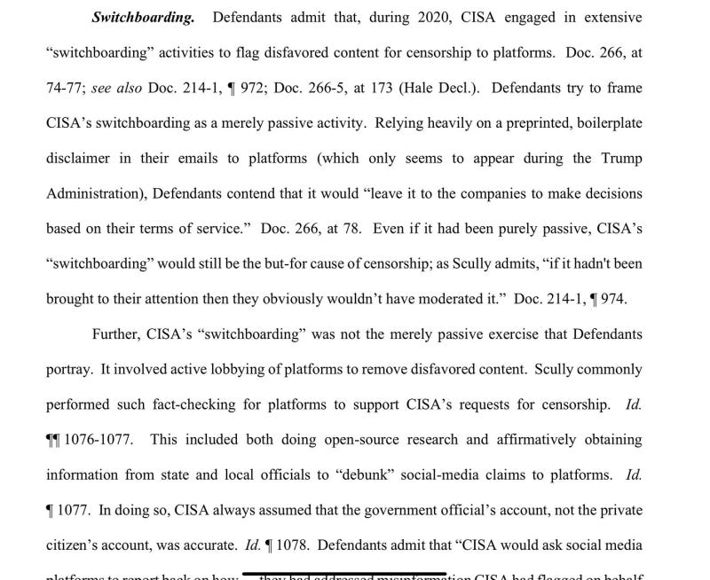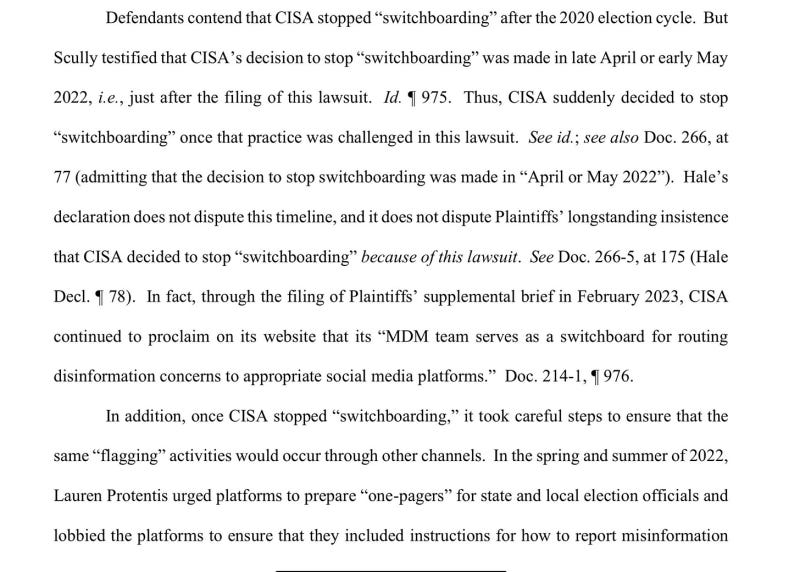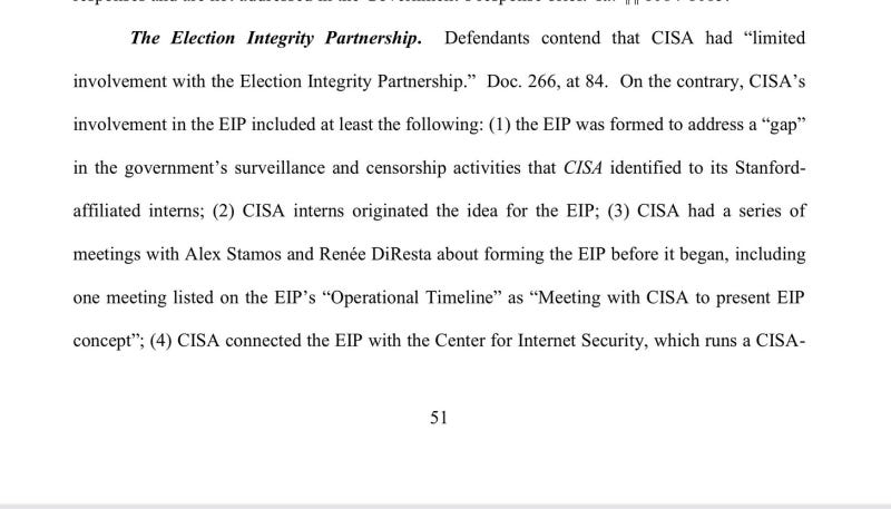 The government also claims that CISA had nothing to do with the EIP (Election Integrity Project); but through discovery in this case we learned that the EIP was formed precisely to be the “gap” between what the government thought they could get away with after pushing the envelope and what a private organization could do on behalf of the government. The problem is, under the First Amendment, the Supreme Court has made clear that the government cannot do through a private org what they cannot do officially. Both of these legally constitute state action.