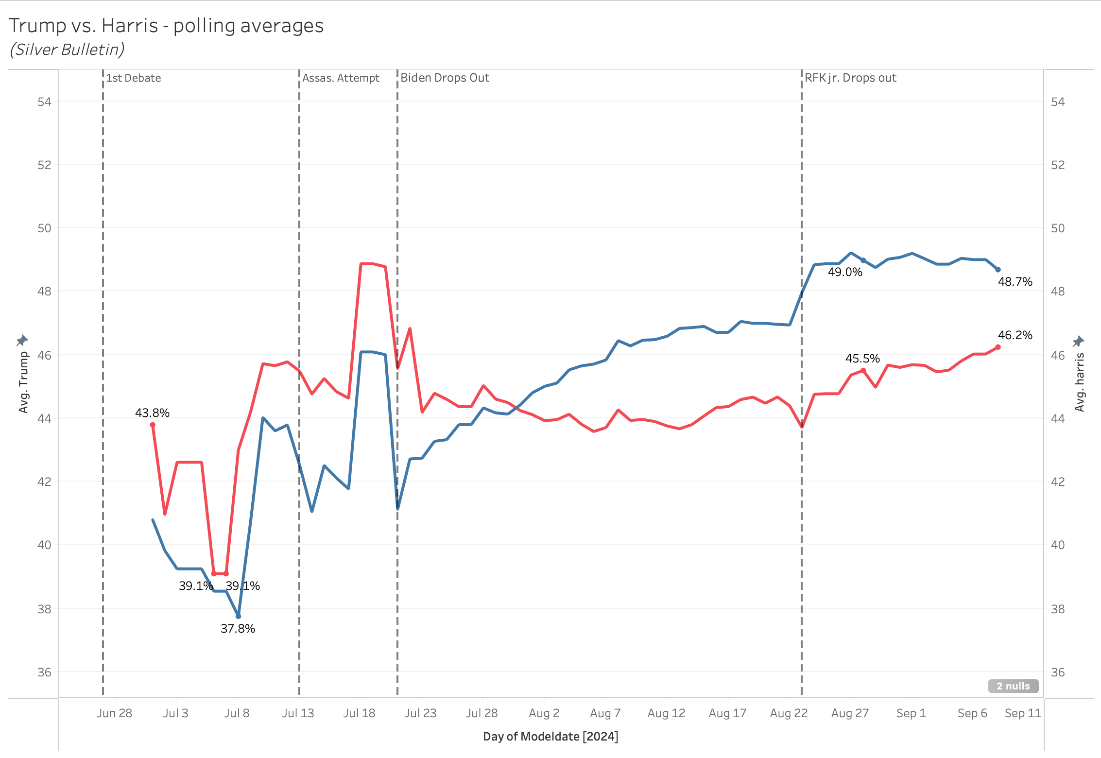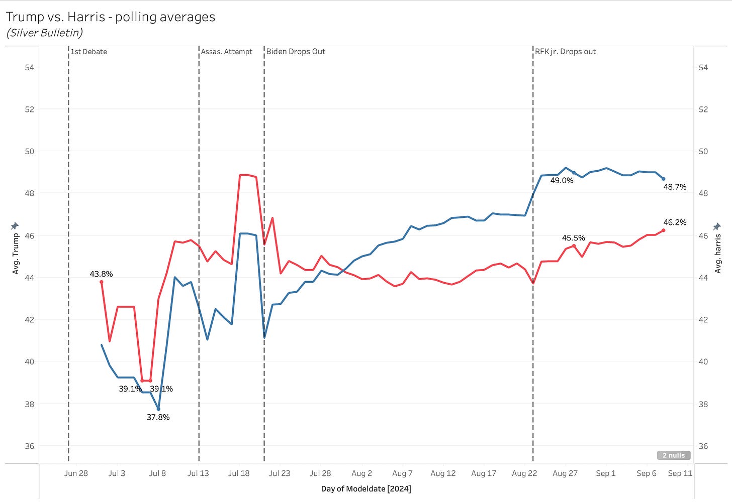The latest polls have the Harris stuck between 1 and 3 percent. Here’s the latest chart showing her lead SLIPPING nationally.