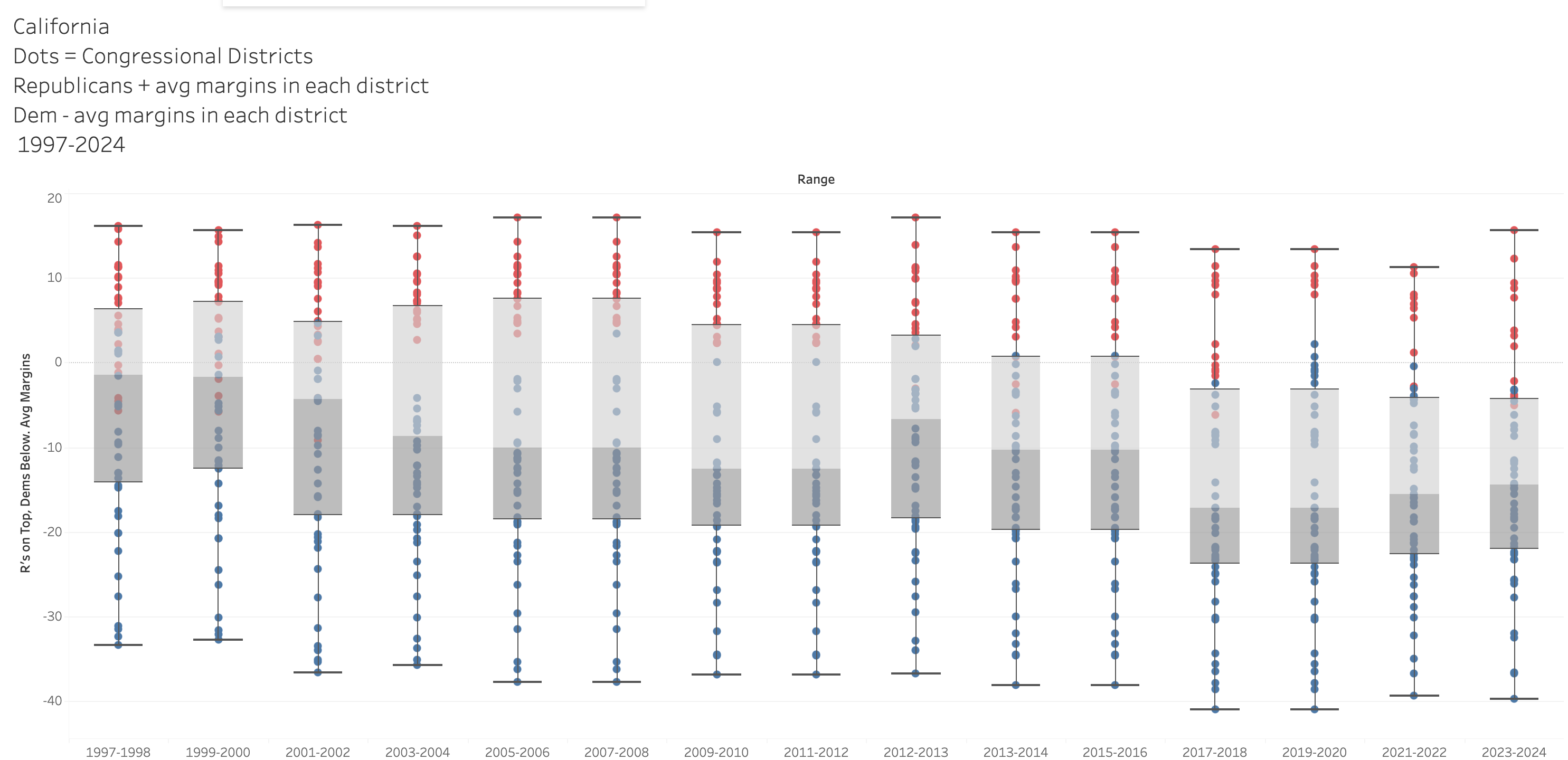 Check out this latest whisker chart for examining the distribution of Republican versus Democratic congressional districts in California over the years. The screenshot highlights how margins have increasingly shifted towards the Democrats, as shown in the lower half of the chart. This tool provides an insightful view into the evolving political landscape.