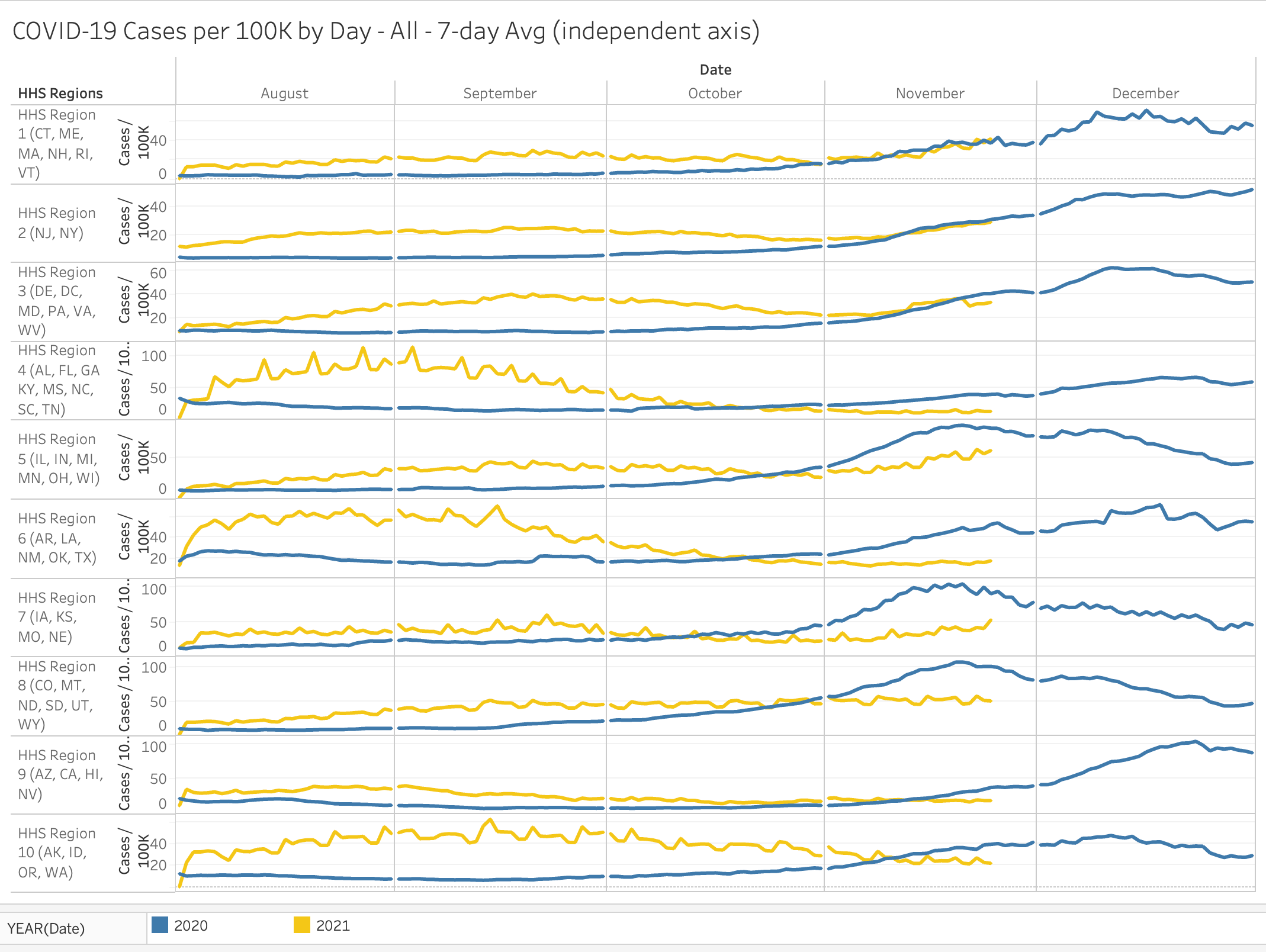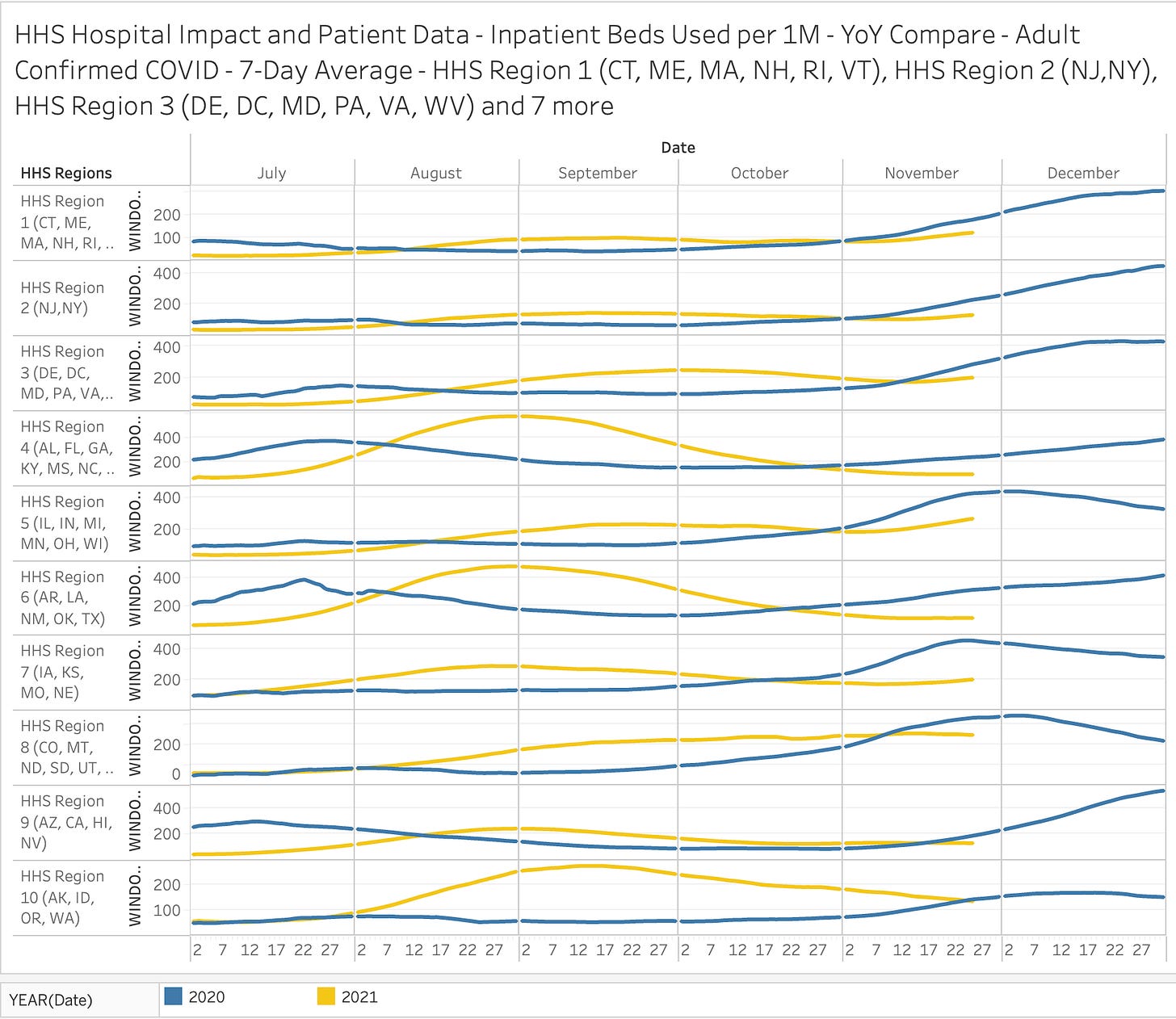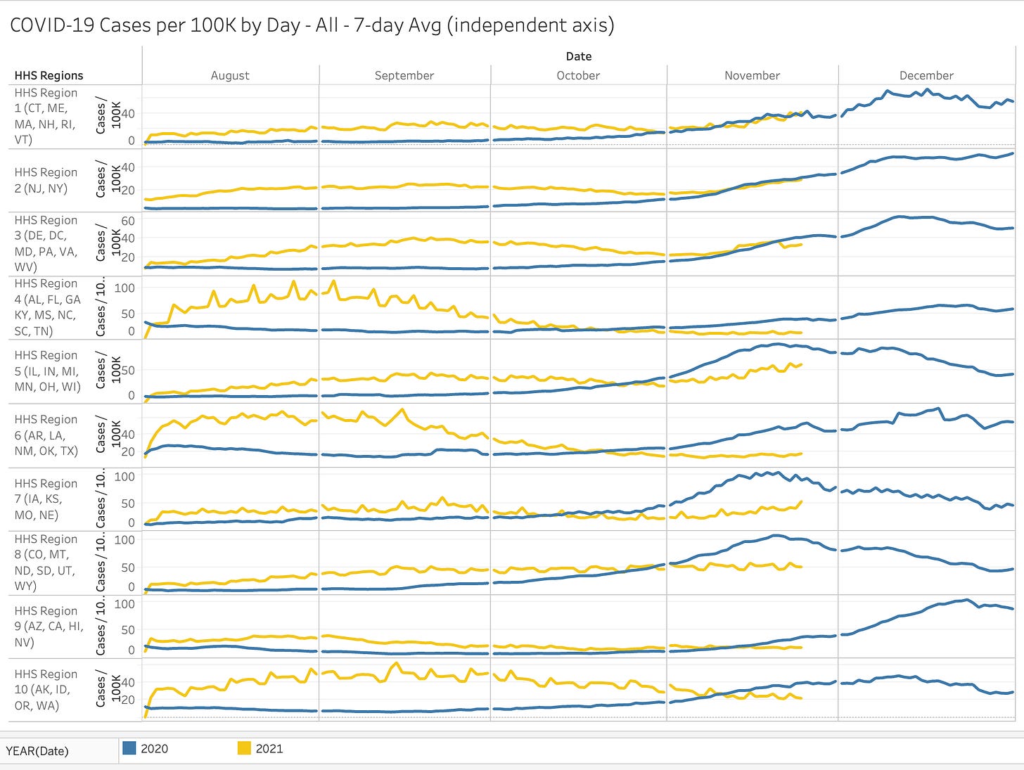 Here are the latest charts for COVID-19 Cases and Hospitalizations by HHS region and state. The charts compare year-over-year - this really gives a sense of the seasonality behind all of this.