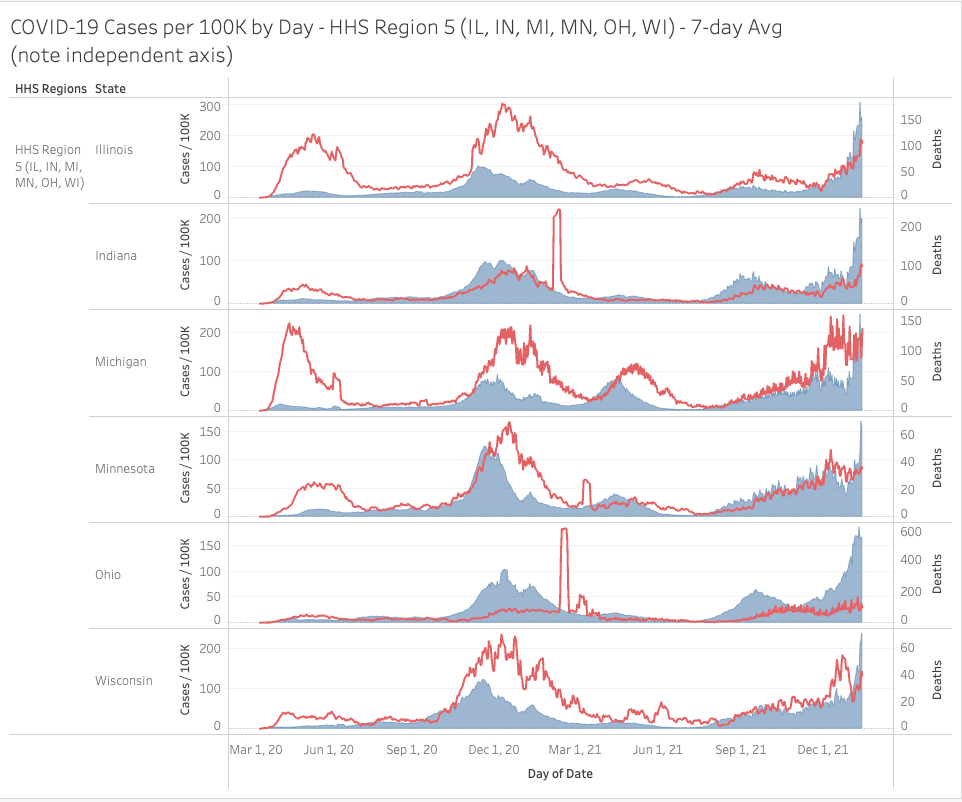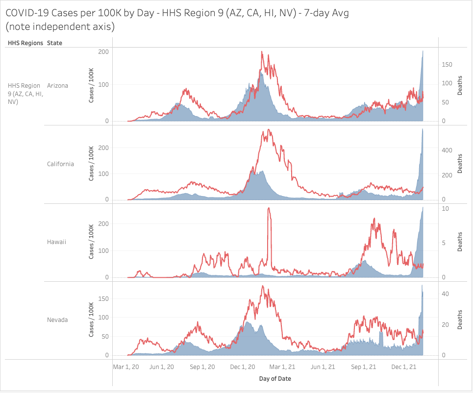 In general, the Omicron massive wave of cases should crest and fall like a rock in the next few weeks. California is still climbing so they will lag behind. We expect mortality from this wave to be MUCH lower that the previous waves. The lesson learned here… you can’t stop a respiratory pathogen. Also, the vaccines have some benefit for individuals but have totally failed to stem variants and the disease itself from spreading.