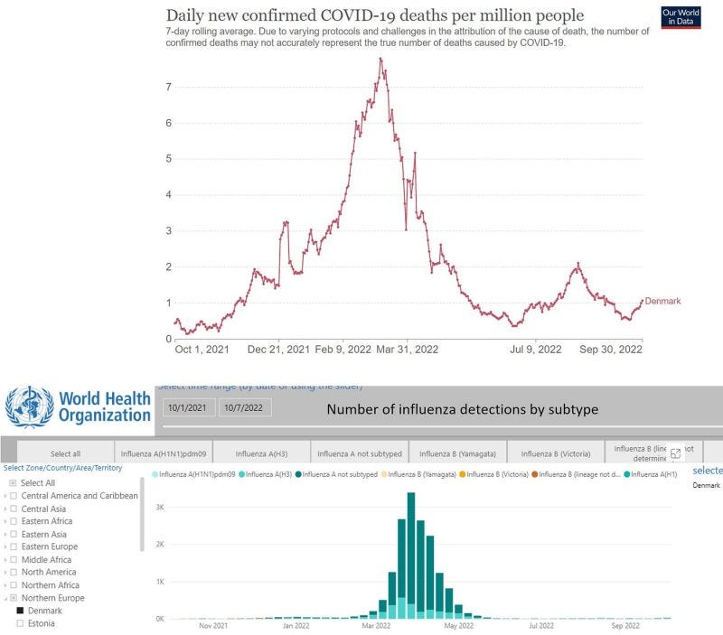 The flu wave in Denmark was short and can account for deaths only in two to three months. It cannot account for much of the 10 percent excess mortality in the past flu year. Some excess deaths might have been due to Covid vaccines and other causes such as late effects of disrupted life. Nonetheless, most of the excess mortality in Denmark must have been Covid deaths, aligned with a major, prolonged Covid wave (6–7 months) and another minor wave (2 months).