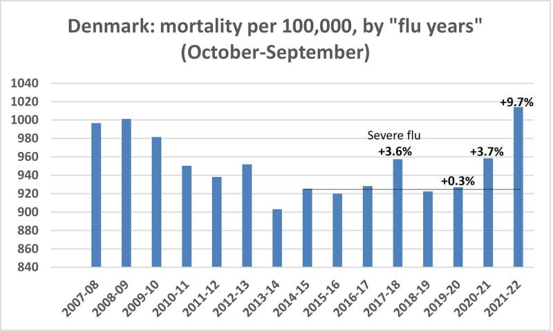 Second, matters got worse in Denmark in the past flu year. Excess mortality unexpectedly rose to 9.7 percent whereas it (modestly) declined in Sweden. In a country with over 50,000 deaths each year, 10 percent excess mortality corresponds to about 5,000 deaths above “normal.”