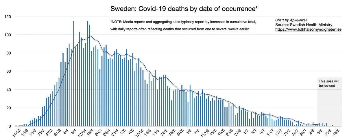 Sweden is still continuing it’s trend of a decline in deaths and cases. While Sweden’s COVID-19 strategy was mocked at the start of the pandemic, additional spikes and waves in lockdown countries will vindicate Sweden’s approach.