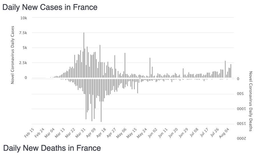 “France's health ministry on Sunday reported 3,015 new coronavirus infections over the last 24 hours, the second day in a row in which new cases have surpassed the 3,000 mark. However, the daily count was below the 3,310 cases reported on Saturday that marked a post-lockdown high, the ministry's data showed. A sharp rise in cases in France has led the authorities in the country's two biggest cities, Paris and Marseille, to expand zones where wearing a mask is mandatory outdoors, while the government is set to propose masks be worn in shared indoor workspaces. But France still plans to reopen schools nationwide in two weeks, and the country's labour minister said Sunday the government is determined to avoid a new nationwide lockdown that would further hobble the economy and threaten jobs. Elisabeth Borne, the labour minister, told the Journal du Dimanche newspaper that the government wants to expand mask use in workplaces.”