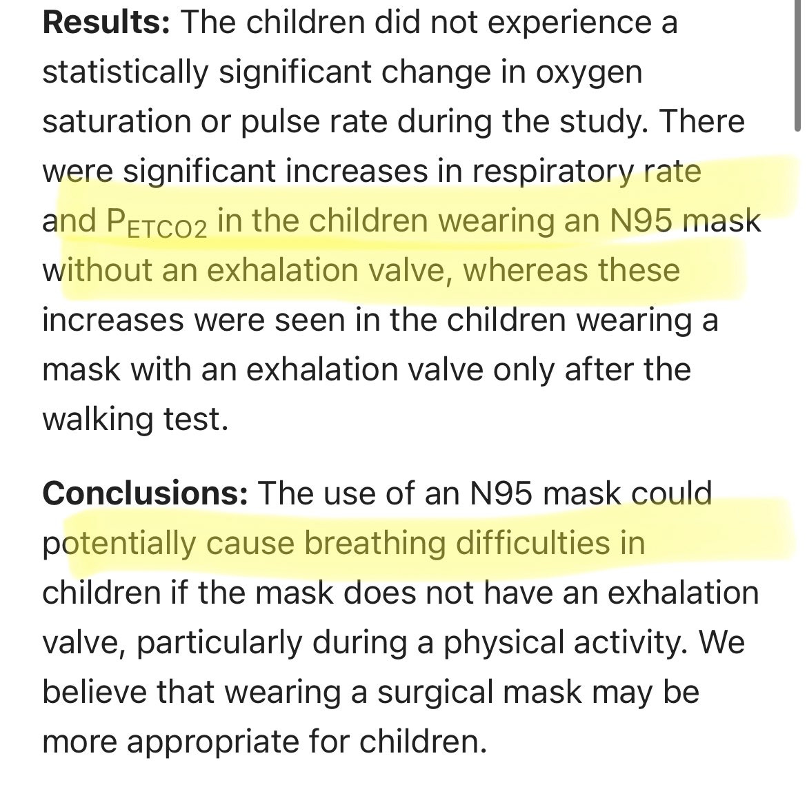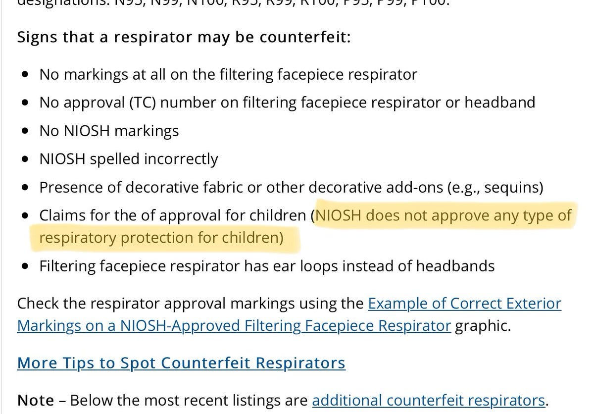 NIOSH (national institute for occupational safety) does not actually approve any type of mask or respirator for children, for the obvious fact that they are untested in that population. Yet public health decided to mask children en masse, in an unprecedented public experiment.