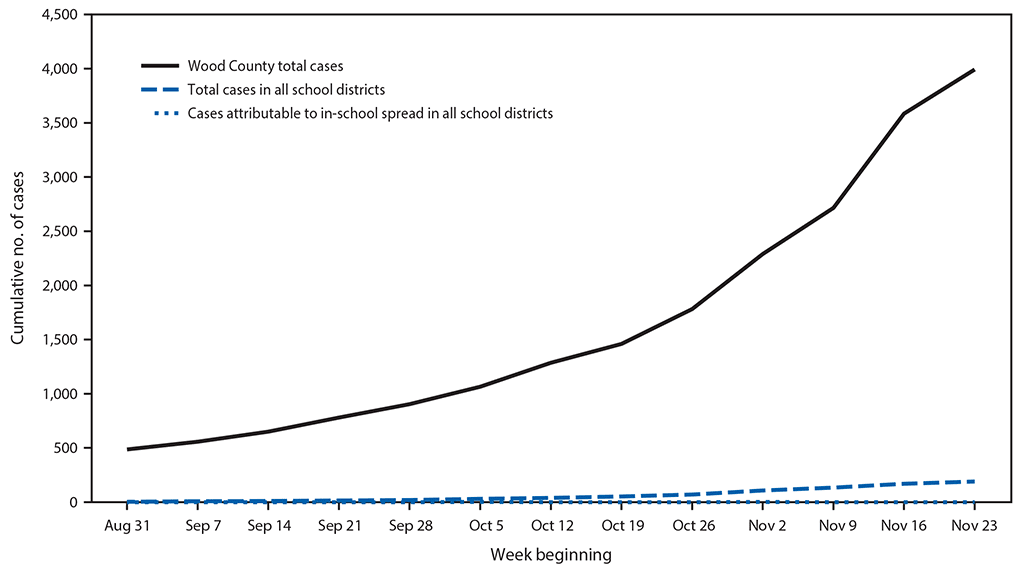 Community % positive was 7% to 40%. Only 191 total cases in 17 K-12 schools, only 7 (3.7%) linked to in-school transmission. Zero student to teacher transmission.