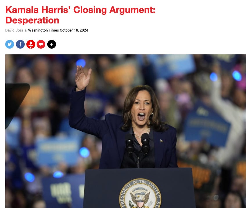 Like myself, not everyone is optimistic about her chances. In fact, some see her current strategy as more desperate than strategic. Harris seems to be throwing everything against the wall, hoping something sticks in the final days of her campaign. The frantic pace and chaotic tactics make for an interesting read as we watch the clock tick down to Election Day. David Bossie makes his case here: