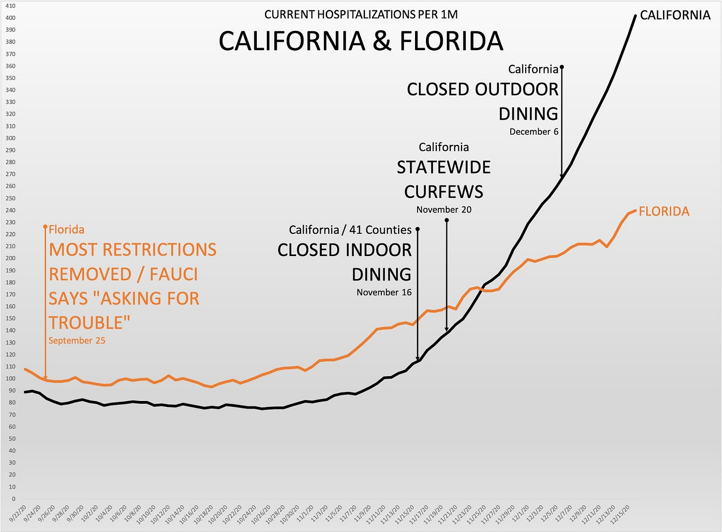 Nearly 3 months after Fauci said Florida was “asking for trouble” by removing capacity restrictions & mask enforcement, California’s hospitalization rate is now 60% higher. That’s despite California having no indoor or outdoor dining, bars, no theme parks or zoos & strict universal masks.