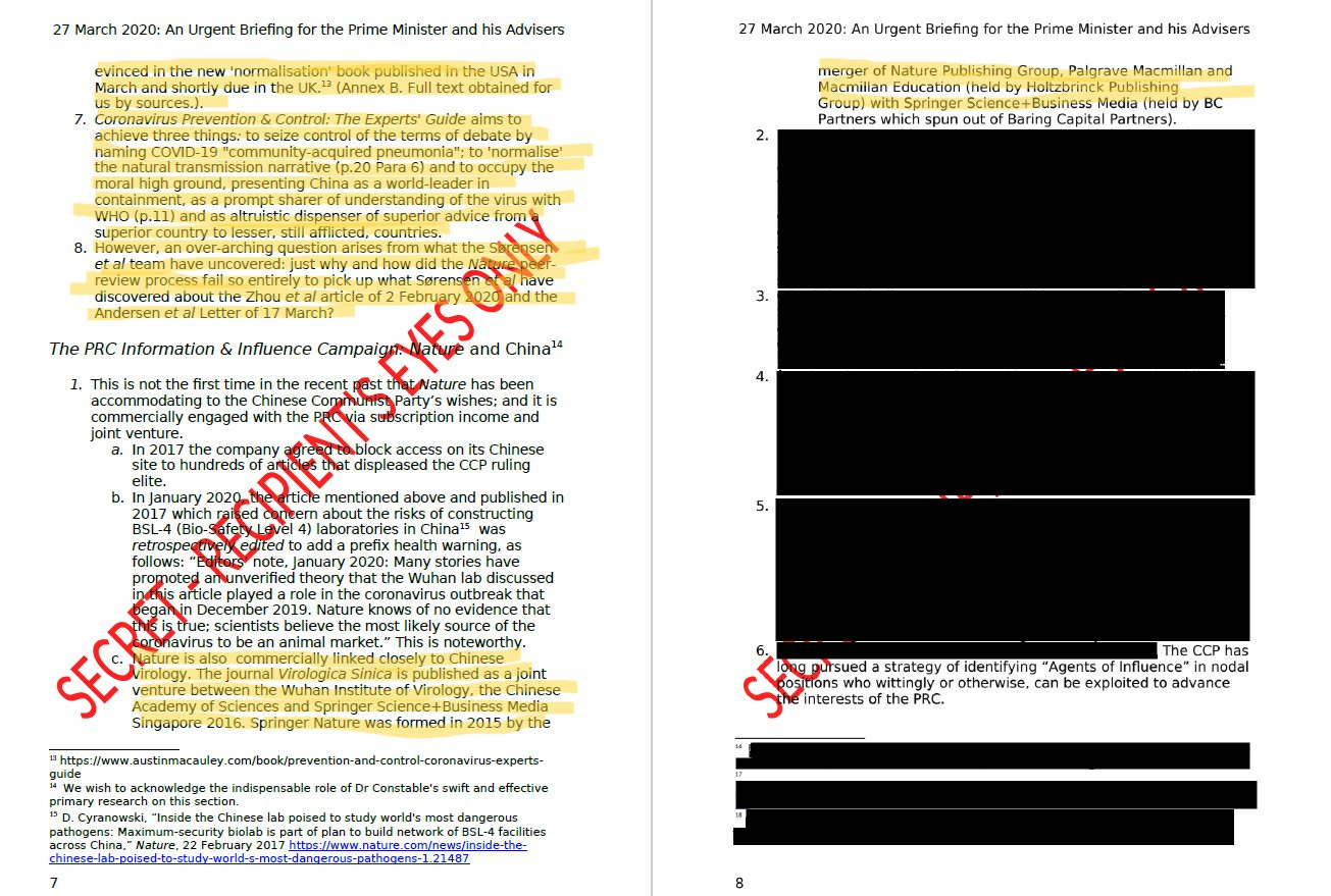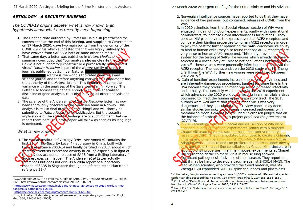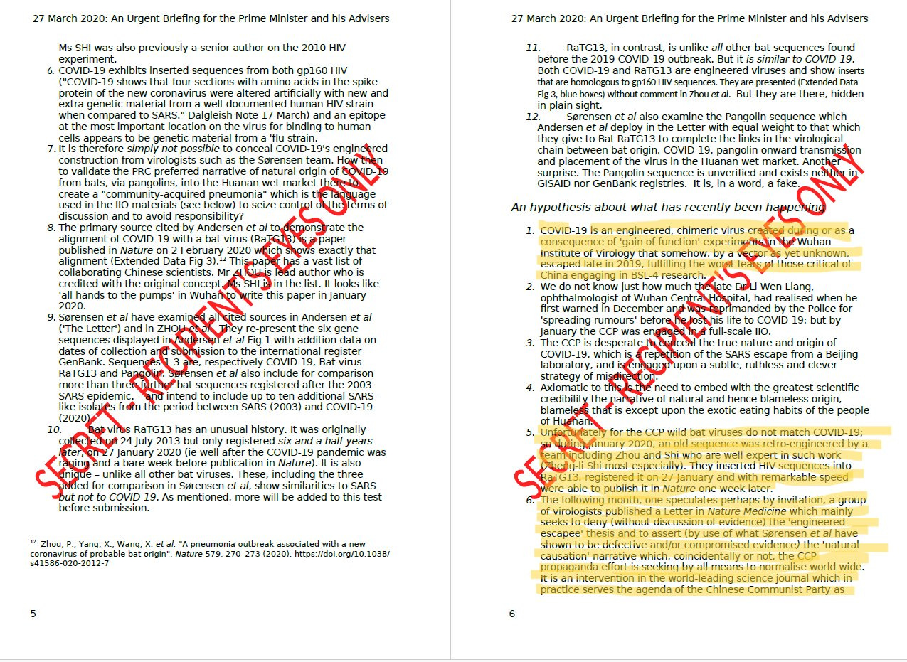 The documents appear to be a briefing note prepared for the UK Prime Minister and his advisors, contain explosive information that challenges the official narrative of the COVID-19 pandemic. According to the briefing, the virus was engineered to be highly infectious and was released from the WIV laboratory in late 2019.