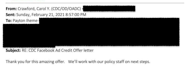 Facebook offered the federal government, and it accepted, $15 million in free COVID-19 public health advertising to promote its public health message on the Internet.