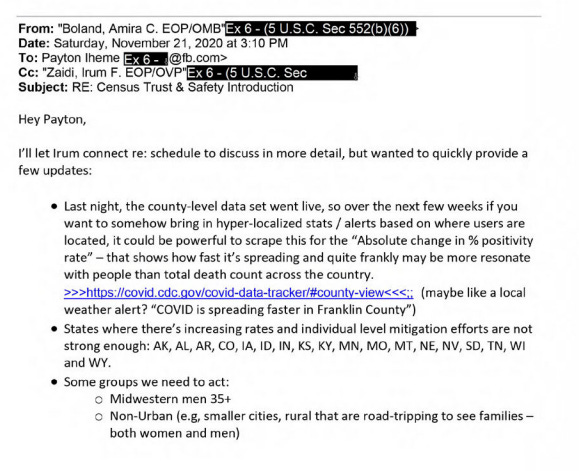 Emails obtained by the group I Can Decide were published between the White House from late 2020 and Facebook showing an extraordinary amount of coordination between the two bodies. The CDC and White House authorities sent copy, imagery and recommended targets to Facebook for advertising purposes. Illegal? Probably not. Creepy and collusion-ary? Absolutely.