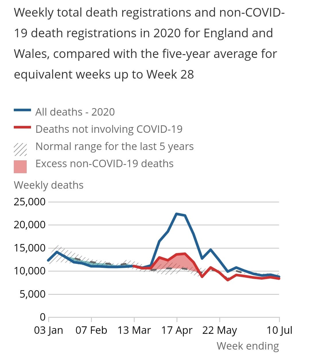 Weekly Total Death Registrations and non-COVID-19 Death Registrations in 2020 for England for Wales, Compared With the Five-Year Average for Equivalent Weeks up to Week 28