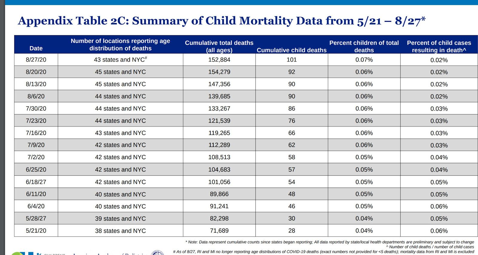 Summary of Child Mortality Data from 5/21 - 8/27