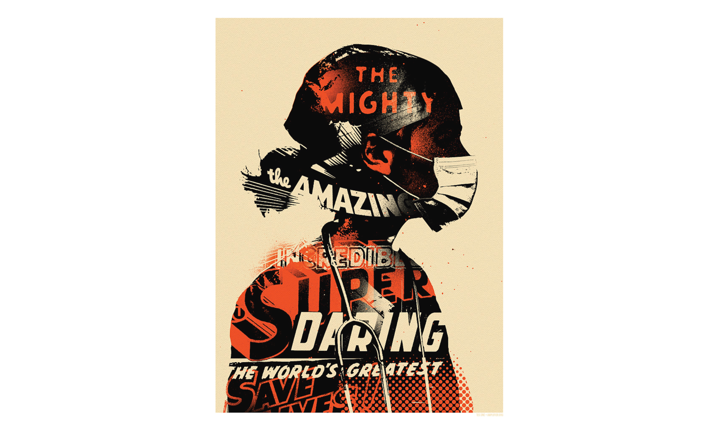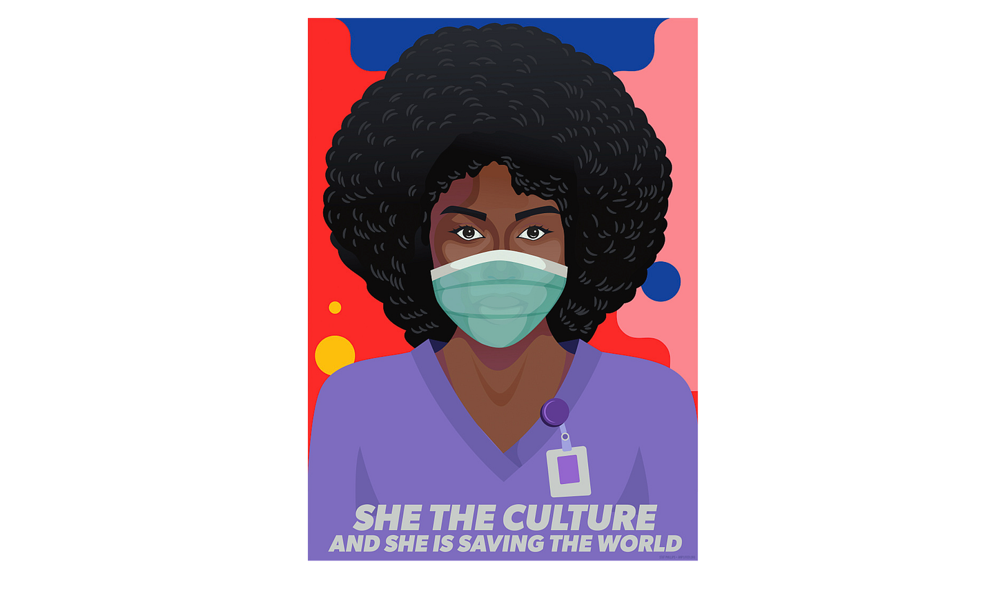 "Inspired by a conversation with my mother and sister (both nurses), who are tasked with providing healthcare during the Covid-19 pandemic for the foreseeable future. I developed this piece to provide an illustration for underrepresented women of color on the front lines fighting the spread of a worldly disease." Teddy "Stat" Phillips aka Stat the Artist