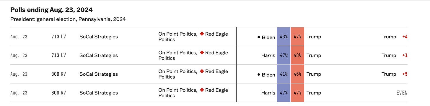 Right now, Trump’s chances to win the election rest on Pennsylvania. We’ll see as the weeks continue how her performs.