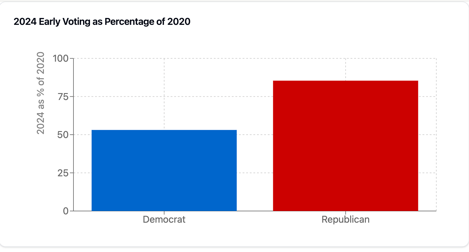 This disparity suggests either a shift in Democratic voting behavior toward Election Day voting, reduced enthusiasm, or both, while Republican voters are largely maintaining their early voting habits from 2020