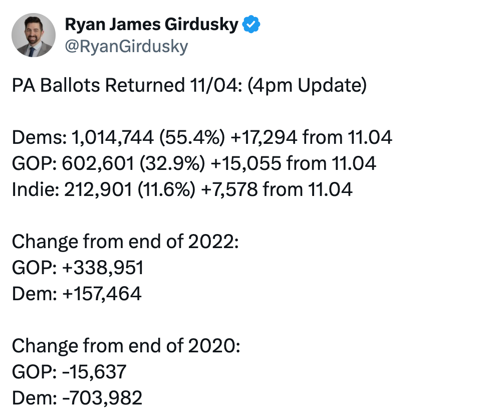 The numbers are particularly noteworthy in Bucks County, where Republican early voting has jumped 16.6% (from 36,796 to 42,904), while Democratic participation has dropped by 26.77% (from 89,093 to 65,241). Similar patterns are playing out in Northampton County, with an impressive 18.48% Republican increase in early voting. These trends, especially in traditionally competitive suburban counties, could indicate a significant enthusiasm gap between the parties and might foreshadow broader electoral shifts in this crucial battleground state. Stay tuned for more detailed analysis as we continue tracking these numbers!