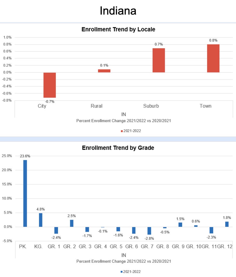 In Indiana, where total enrollment grew 0.3% from 2020/21 to 2021/22, you will note the locale trend is consistent with the national trend. Pre-K and K had the largest enrollment increases, and three other grades besides Grade 9 had enrollment increases.