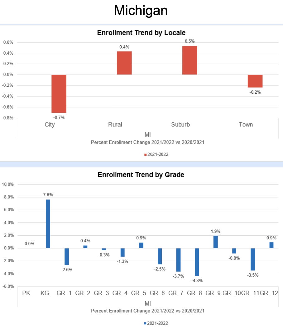 In our final example, Michigan had a 0.4% increase in enrollment. The "Town" category (which has the smallest increase of the non-City locales at the national level) declined along with the City districts. Michigan doesn't track Pre-K enrollments, but again there is an increase in kindergarten and ninth grade.
