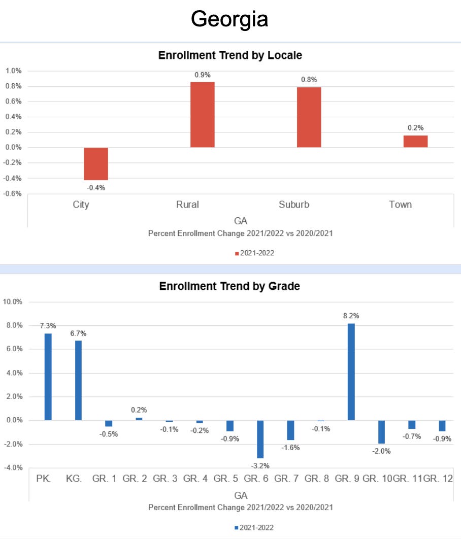 Georgia had a 0.6% increase in enrollment. The "increase/decrease" trends for locale, and the grade-level changes, were consistent with the national pattern.