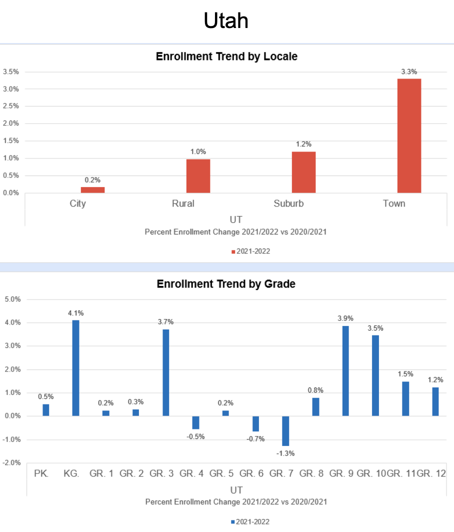 Utah's enrollment grew by 1.3% For this state, all the locales increased, with the "City" increase being the smallest. Grade level patterns were a bit different than national, but with large increases in Pre-K/K and Grade 9 in the figures.
