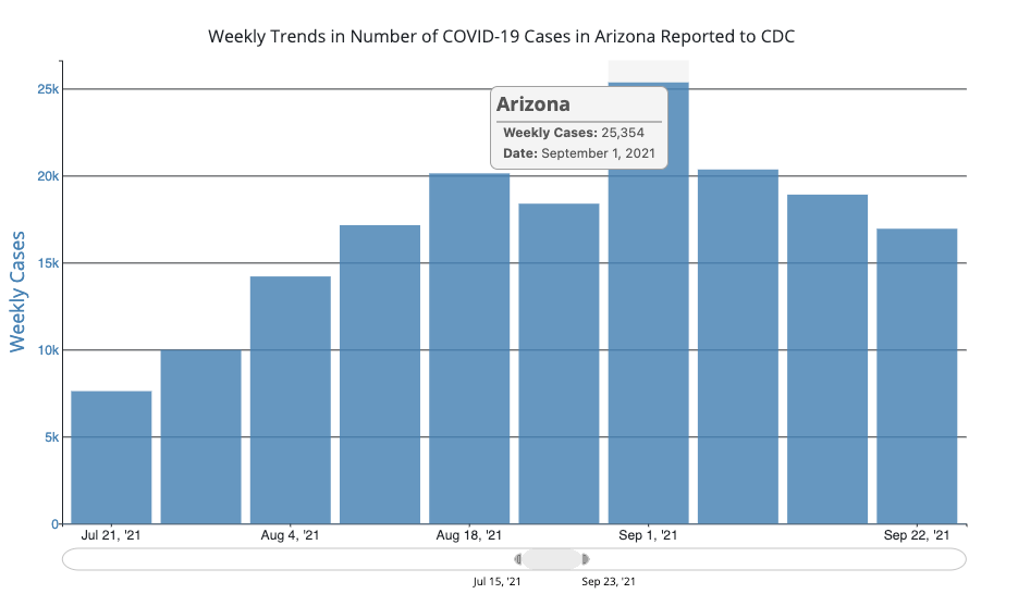 In 2021, CDC authors looked at Arizona schools from July 1–September 4, 2021 and compared those institutions which had mask mandates and those that did not. School starts a bit earlier than most states in Arizona but they conveniently ended their study RIGHT at the peak of the cases for that summer/fall in Arizona.