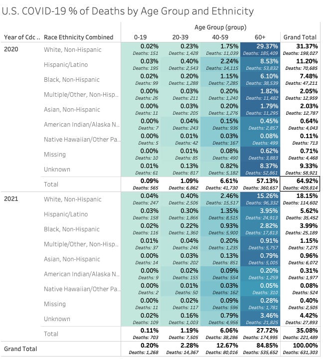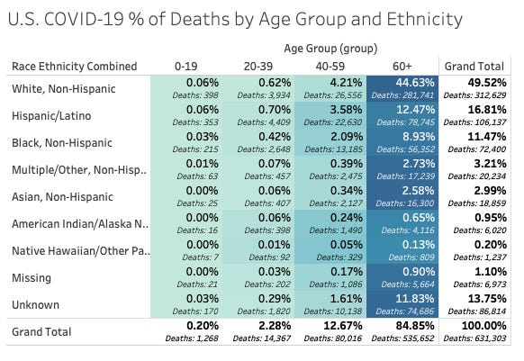 Generally, with race and ethnicity we find that the distribution of deaths also seems to follow population distributions. Here’s a breakdown of age and race/ethnicity provided by the file into a table with a heat color showing the % of deaths for the entire pandemic for that intersection of age and race.
