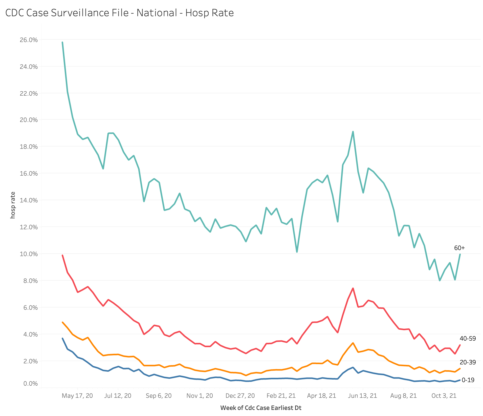 For example, we can see the hospitalization rate across the months by age group: