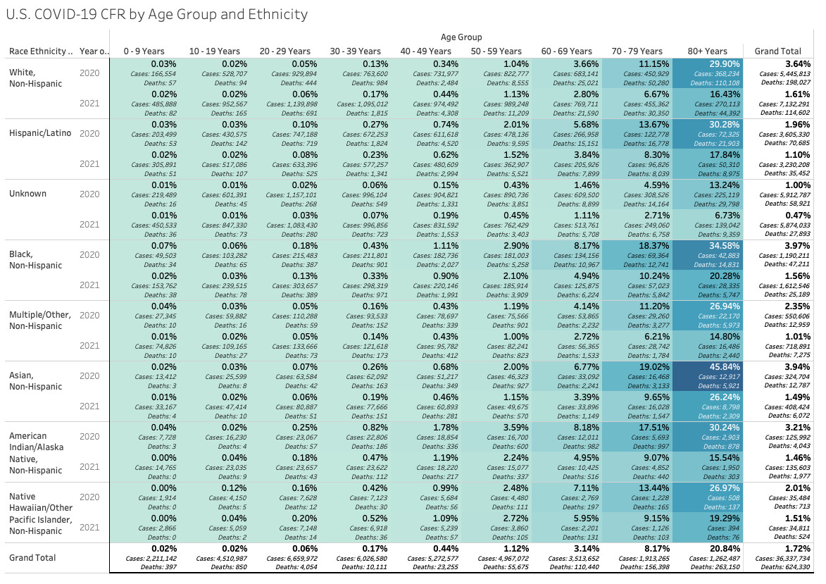 But let’s dive deeper. Here’s a chart of MORE granular age breakdowns showing the Case Fatality Rate (CFR) for each race and by year. Remember, Case Fatality Rate can be skewed by testing but this does give us some insights.