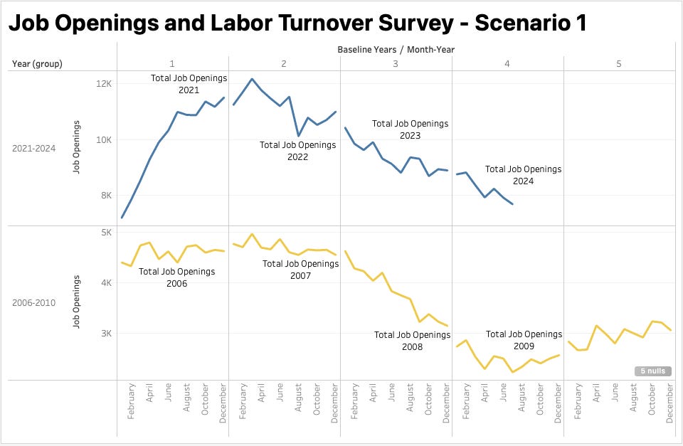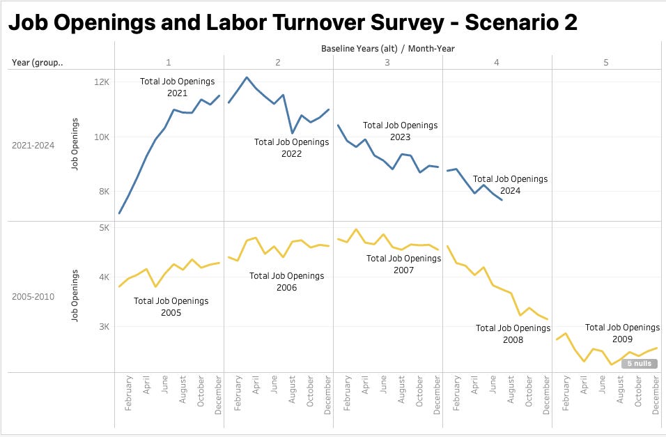 SCENARIO 1 :: 2021-2024 vs. 2006 - 2010+ → in this scenario, we line up 2021 with 2006. Jobs are openings peak in 2007/2022 and start on their way down. If history is any measure than jobs may start picking up by the end of the year.