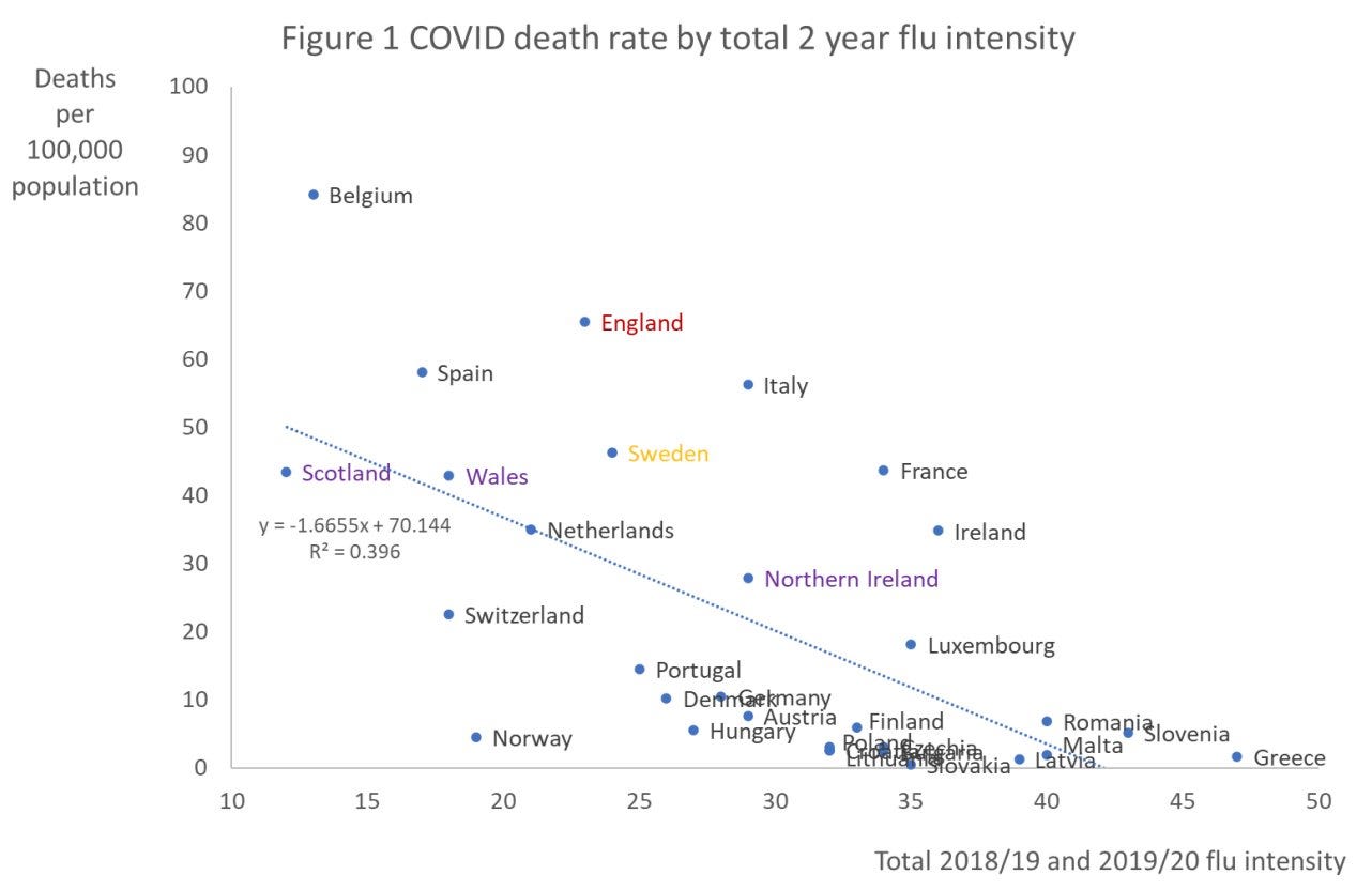 There is a statistically significant correlation between the mildness of recent flu seasons and COVID fatalities.COVID outcomes appear to be more related to the size of high-risk populations than policy decisions.