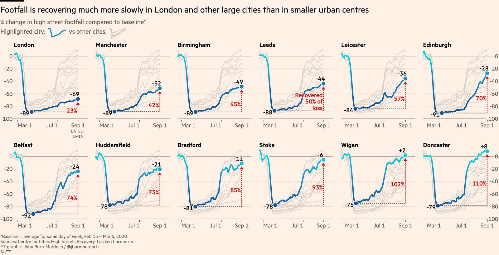 Footfall is Recovering Much More Slowly in London and other Large Cities than in Smaller Urban Centers