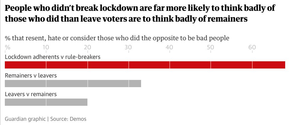 People who didn’t break lockdown are far more likely to think badly of those who did than leave voters are to think badly of remainers