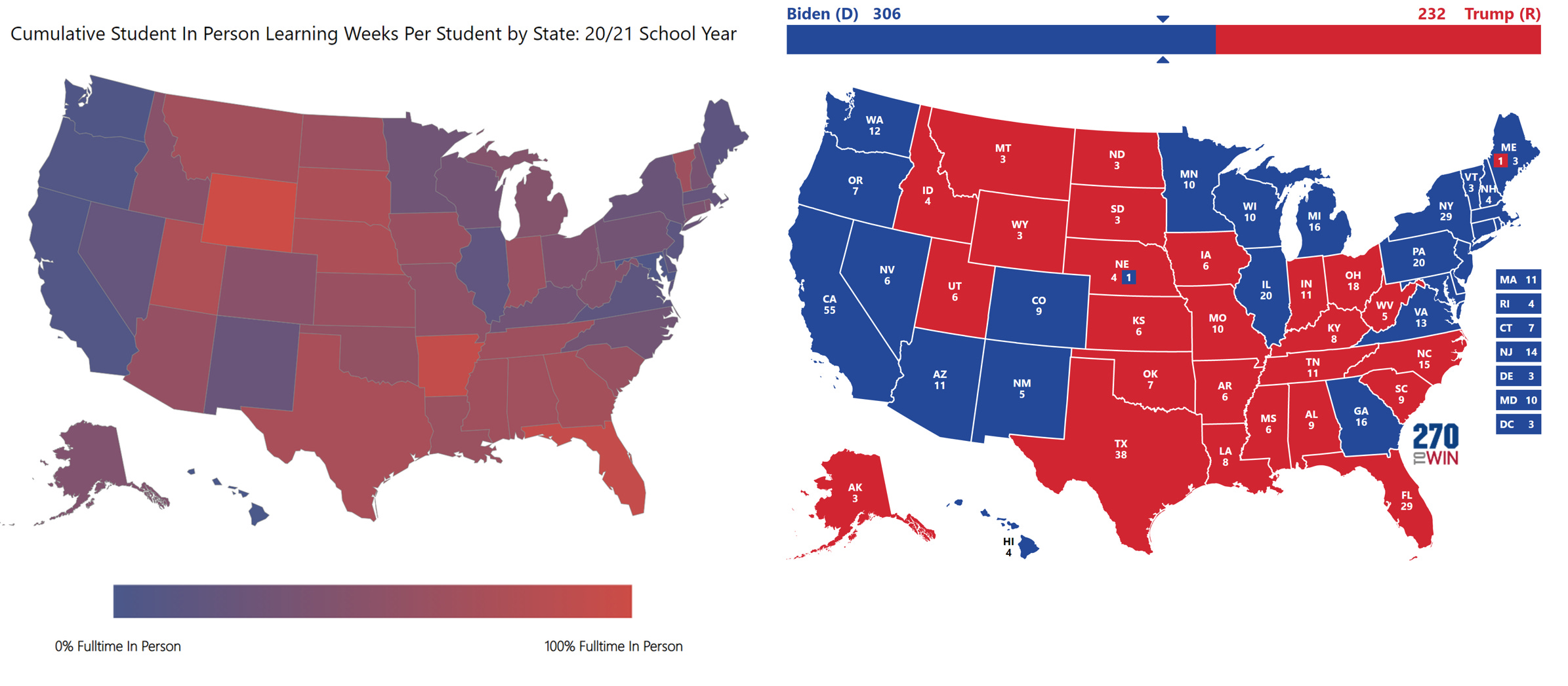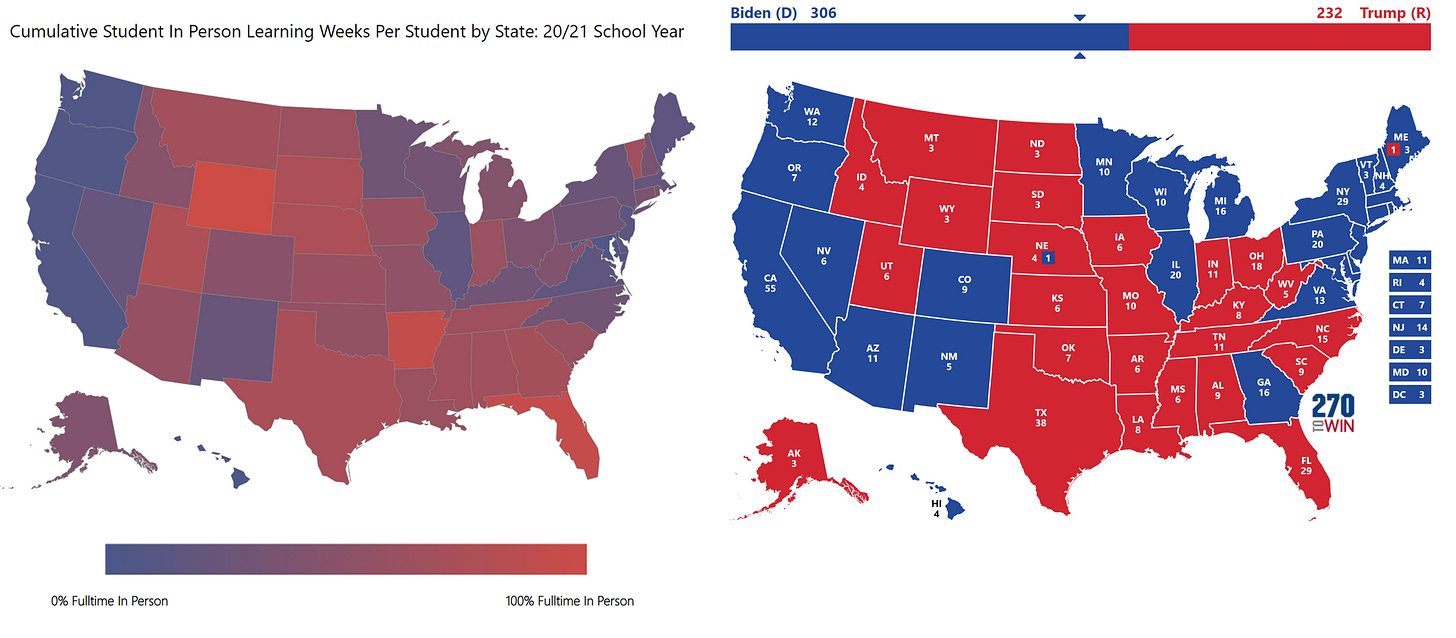 Compare the chart on the left, which shows cumulative in-person learning by state (more red= more open schools, more blue = less open schools) with the election map on the right. The correlation is unmistakable.