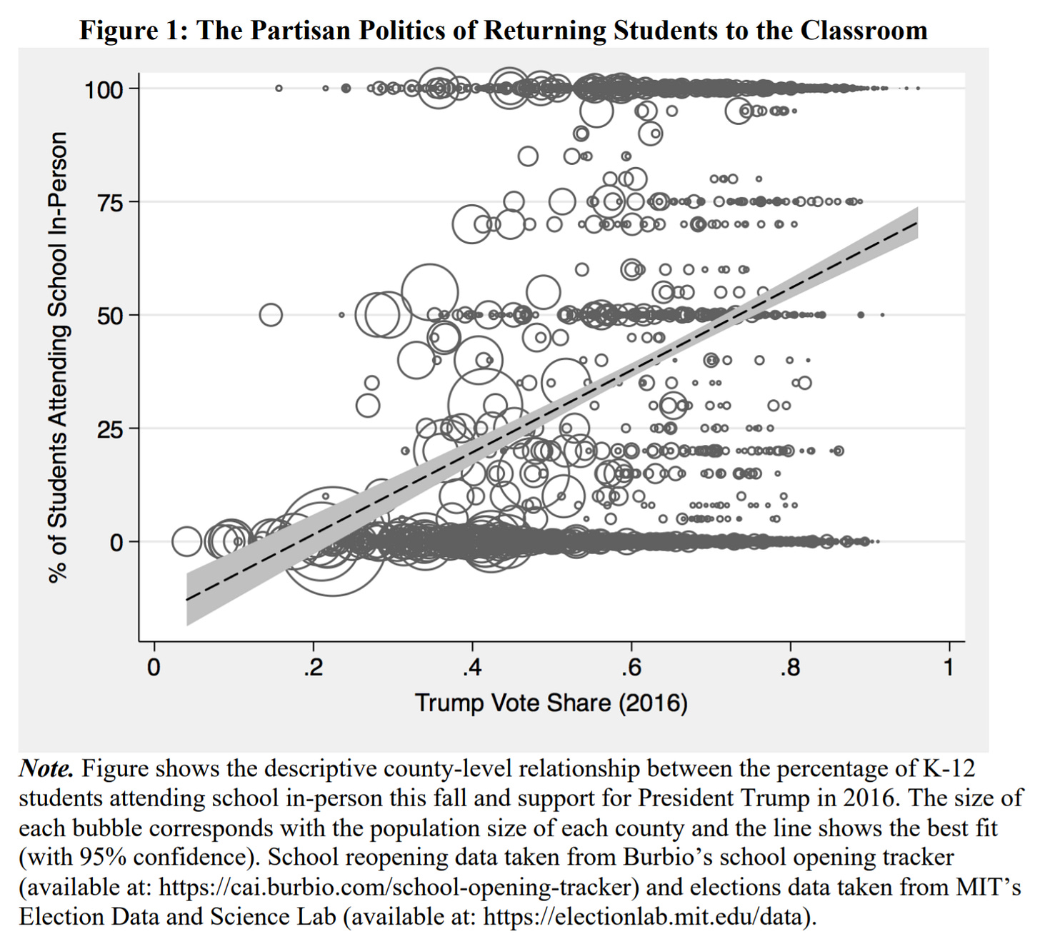 “As Figure 1 shows, the decision to return students to in-person classes this fall was strongly correlated with the county-level share of the vote won by Donald Trump in 2016”