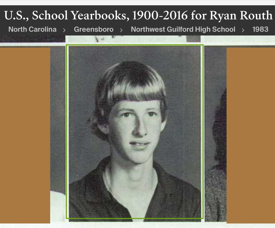 It appears that Ryan Ruth, a 58-year-old North Carolina resident who previously lived in Hawaii, made an attempt on President Trump’s life at his golf course. I’ve done some research using databases I frequently access for these types of investigations and here’s what I’ve uncovered so far. I’ll be putting some of this behind a paywall since not all the details are fully verified yet, and I want to be cautious. However, if you're interested in seeing yearbook photos and records of the numerous articles he’s written to various newspapers over the years, make sure to subscribe below.