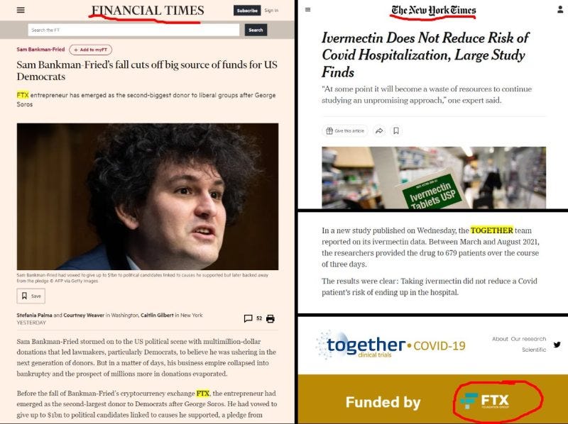 Earlier this year, the New York Times trumpeted a study that showed no benefit at all to the use of Ivermectin. It was supposed to be definitive. The study was funded by FTX. Why? Why was a crypto exchange so interested in the debunking of repurposed drugs in order to drive governments and people into the use of patented pharmaceuticals, even those like Ramdesivir that didn’t actually work? Inquiring minds would like to know.